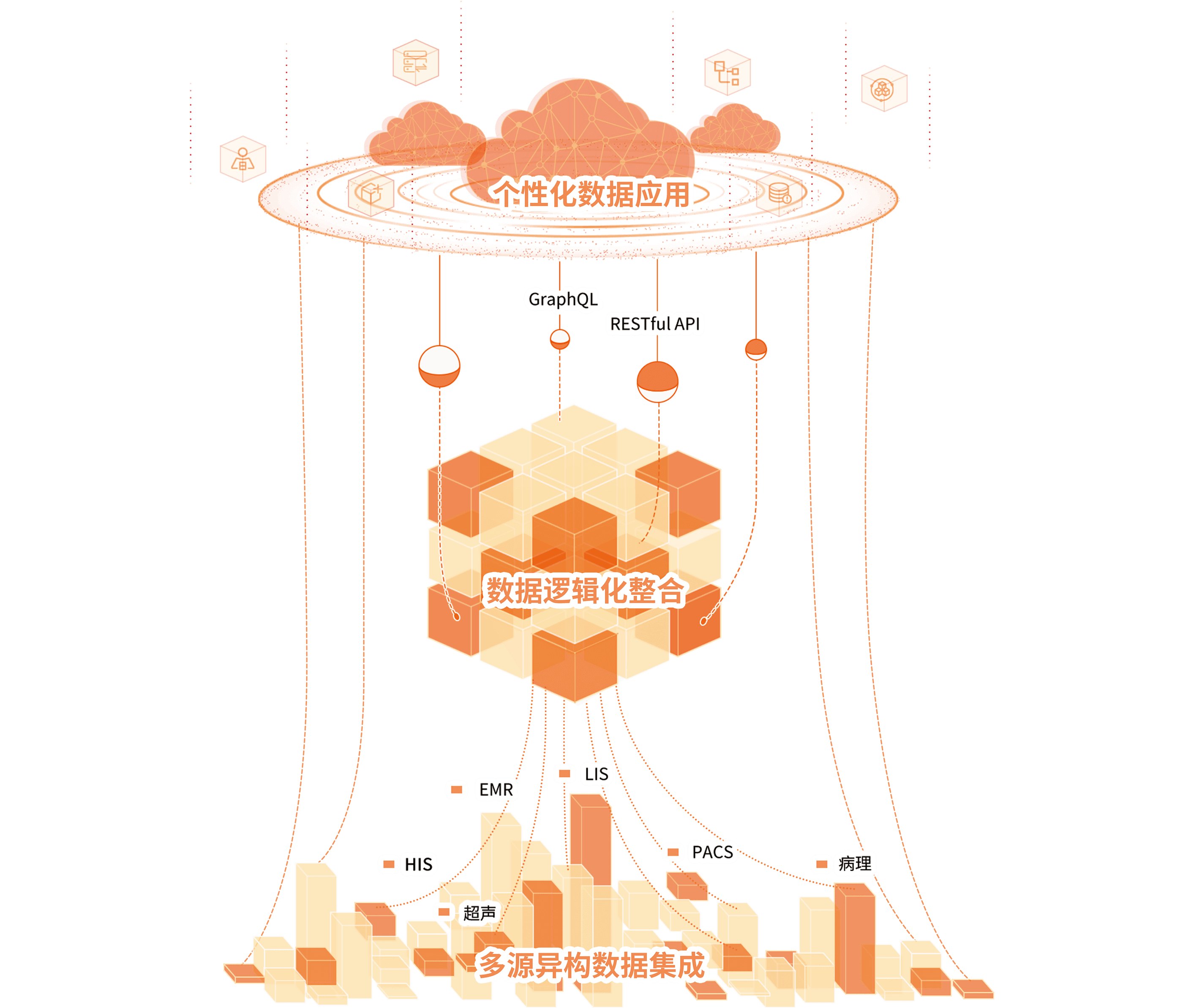 醫(yī)眾醫(yī)療數(shù)據(jù)服務采用 Data Fabric 數(shù)據(jù)編織的架構理念,幫助用戶應對在數(shù)據(jù)資產(chǎn)化進程中產(chǎn)生的復雜性、分布式、多元化等因素,從單純的以數(shù)據(jù)應用為核心建設數(shù)字化,向體系化的數(shù)據(jù)服務能力建設轉型。